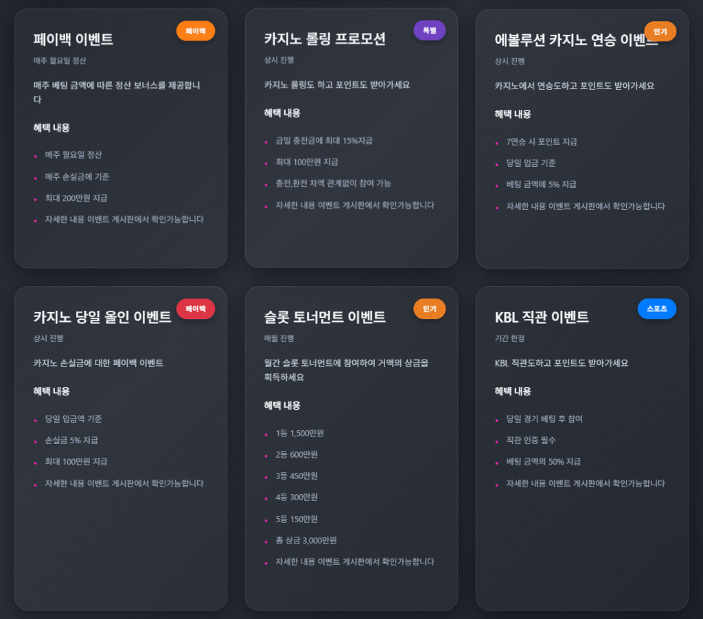 페이백 이벤트는 전 주의 베팅 내역을 기준으로 손실 금액을 산정하여, 일정 비율의 보너스를 지급하는 주간 리워드 프로그램입니다. 회원 등급에 따라 지급률이 다르며, 참여자는 자동으로 정산 대상에 포함됩니다.