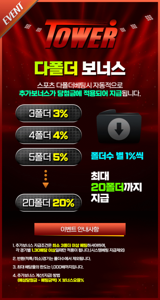 타워벳에서 제공하는 다폴더 보너스 이벤트는 스포츠 유저들에게 실질적인 추가 수익을 안겨주는 자동 혜택 시스템입니다. 베팅 조합이 많아질수록 보너스 비율도 함께 증가하여, 다폴더 전략을 선호하는 유저라면 반드시 참고해야 할 이벤트입니다.