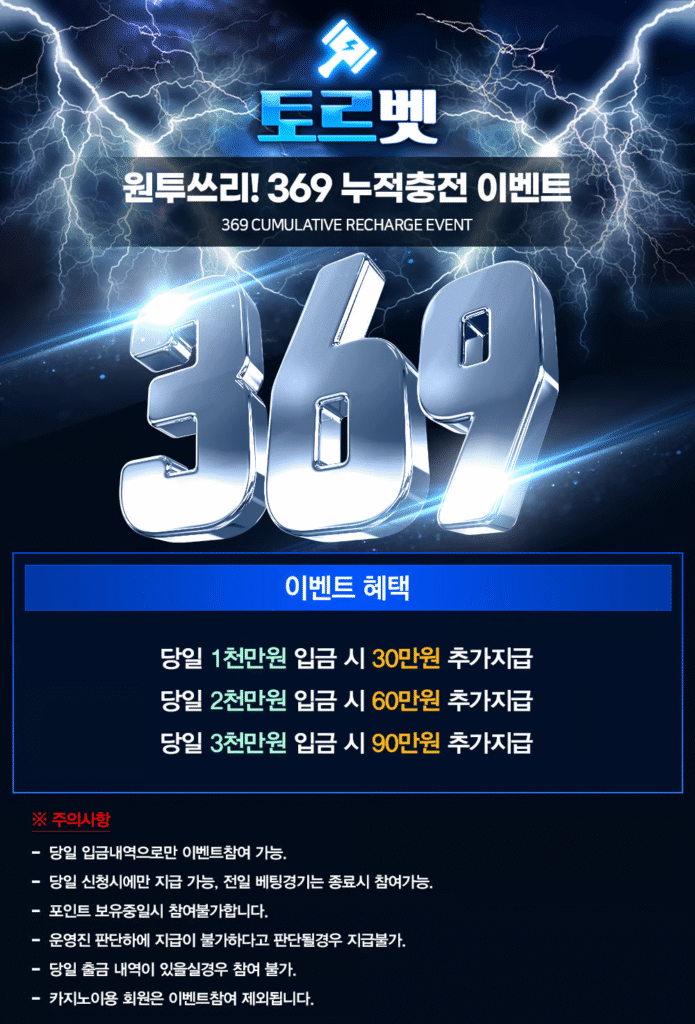 토르벳에서는 일정 금액 이상 누적 충전 시 추가 혜택이 제공되는 369 누적 충전 이벤트를 운영하고 있습니다. 당일 충전 금액을 기준으로 단계별 보상이 지급되는 구조입니다.