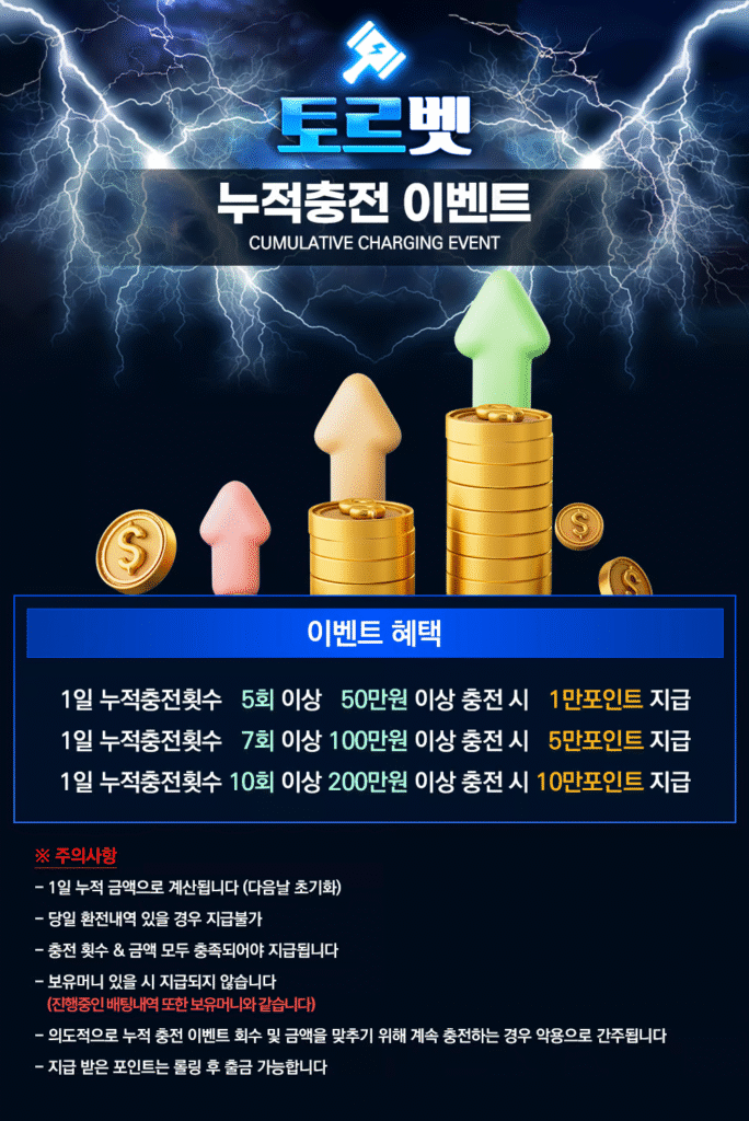 토르벳에서는 하루 동안의 충전 횟수와 누적 충전 금액을 기준으로 포인트가 지급되는 누적 충전 이벤트를 운영하고 있습니다. 일정 기준을 충족할 경우 단계별 혜택이 제공되는 구조입니다.