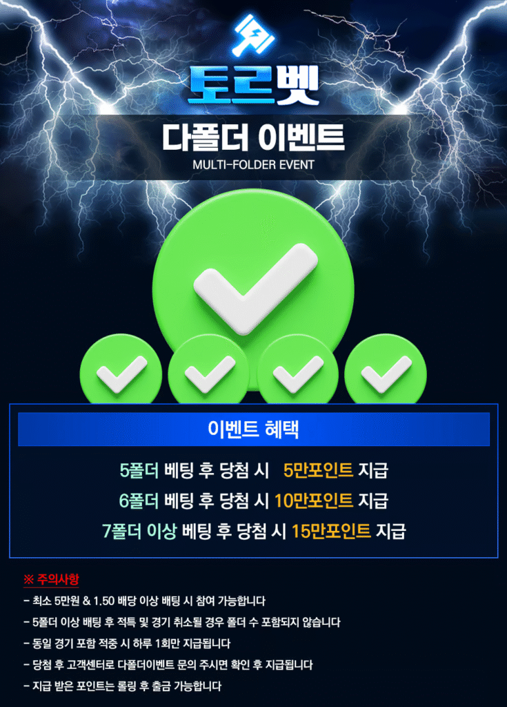 토르벳에서는 다폴더 베팅 적중 시 포인트가 지급되는 다폴더 이벤트를 운영하고 있습니다. 폴더 수에 따라 지급 포인트가 단계적으로 달라지는 구조입니다.