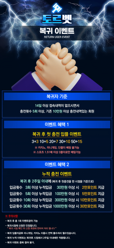 토르벳에서는 일정 기간 이용 이력이 없는 회원을 대상으로 복귀자 전용 혜택이 제공되는 복귀 이벤트를 운영하고 있습니다. 복귀 이후 첫 충전과 누적 충전 조건에 따라 단계별 혜택이 구성된 방식입니다.