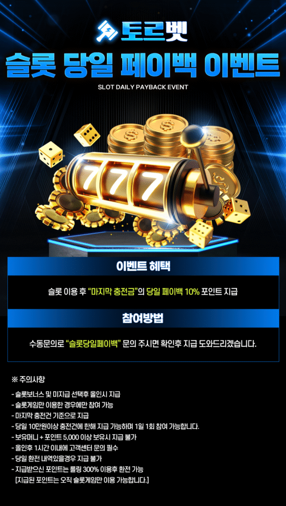 토르벳에서는 슬롯 게임 이용자를 대상으로 당일 충전 기준 페이백 혜택이 제공되는 슬롯 당일 페이백 이벤트를 운영하고 있습니다. 슬롯 이용 후 조건 충족 시 포인트가 지급되는 구조입니다.