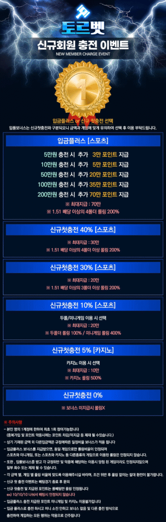 토르벳에서는 신규 회원을 대상으로 첫 충전 방식에 따라 선택 참여가 가능한 신규 회원 충전 이벤트를 운영하고 있습니다. 스포츠, 카지노, 미니게임 등 이용 콘텐츠에 따라 보너스 구조가 구분된 형태입니다.