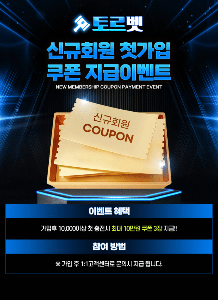 토르벳에서는 신규 회원을 대상으로 첫 가입 이후 첫 충전 조건을 충족할 경우 쿠폰이 지급되는 첫가입 쿠폰 지급 이벤트를 운영하고 있습니다.