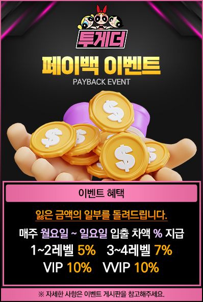 투게더카지노는 이용자가 발생시킨 입출금 차액을 기준으로 일정 비율을 되돌려주는 페이백 이벤트를 운영하며, 레벨 구분에 따라 차등 지급되는 형태로 구성되어 있습니다.