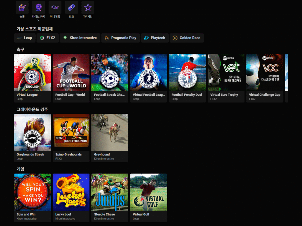 2. 원하는 카테고리(슬롯, 라이브 카지노, 스포츠)를 선택합니다.