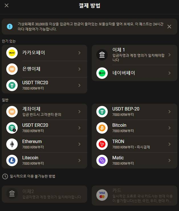 • 계정 잔액이 5,000원 이상일 경우 입금을 진행하면 보너스가 지급되지 않습니다.