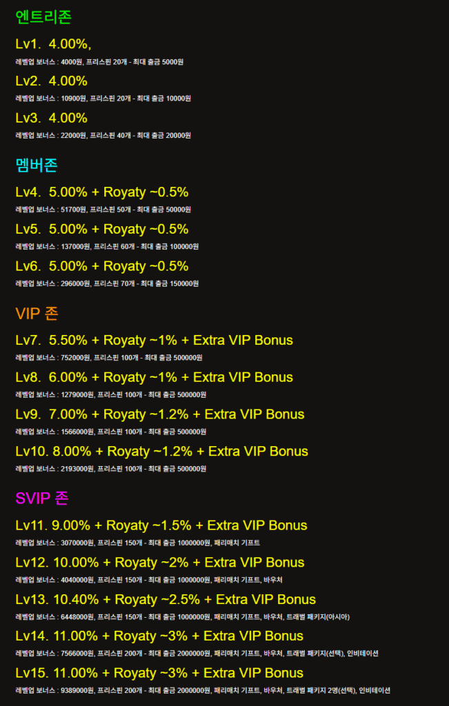 각 구간은 엔트리존, 멤버존, VIP존, 그리고 SVIP존으로 나뉘며, 단계가 높아질수록 보너스율과 추가 혜택이 확대됩니다.