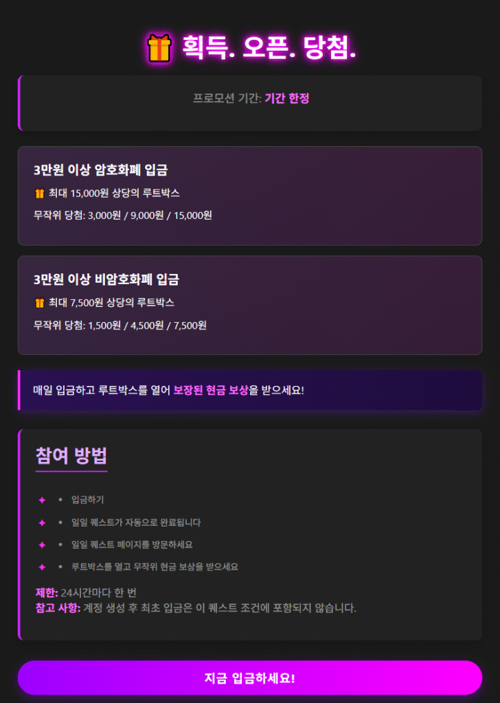 • 중복 참여가 가능하지만, 동일 입금 건에 대해 중복 보너스는 지급되지 않습니다.