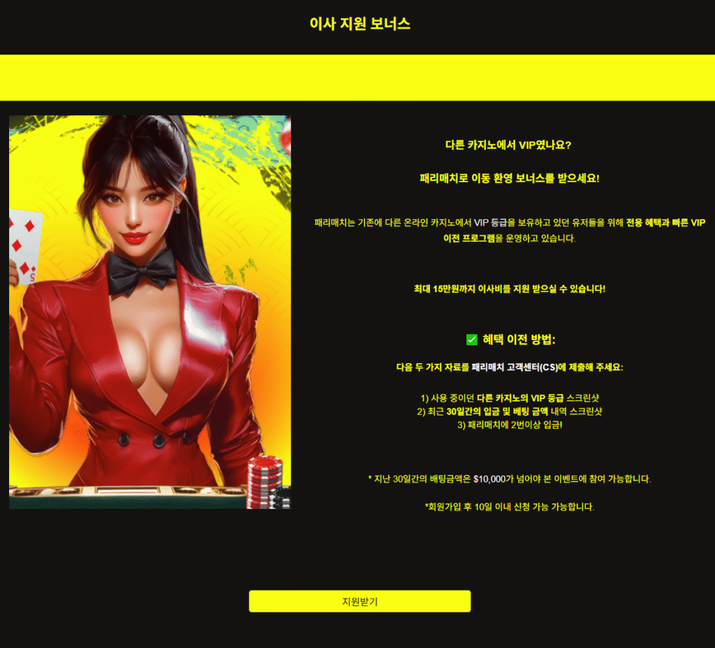 패리매치는 다른 온라인 카지노에서 활동하던 VIP 이용자들을 위해 특별히 마련된 이사 지원 보너스 이벤트를 운영하고 있습니다.