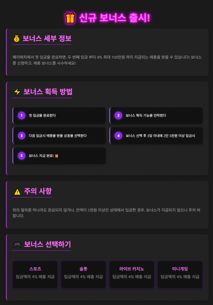 첫 입금을 완료한 후, 두 번째 입금부터는 최대 100만 원까지 입금액의 4%를 매칭 보너스로 받을 수 있으며, 다양한 게임 카테고리에서 자유롭게 혜택을 활용할 수 있습니다.