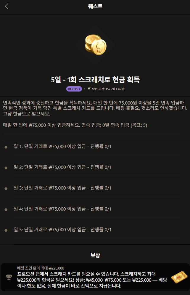 5일 동안 매일 한 번씩 75,000원 이상을 입금하면 하루마다 조건 달성으로 기록됩니다. 5일 연속으로 성공할 경우, 보상이 담긴 스크래치 카드를 받을 수 있으며 베팅 조건 없이 현금으로 즉시 지급됩니다.
