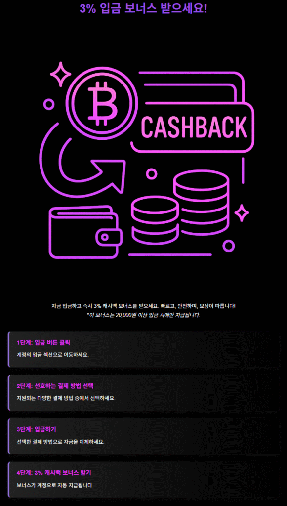 이 이벤트는 모든 회원을 대상으로 하며, 계정에 입금하는 즉시 3% 캐시백이 제공됩니다. 별도의 신청 절차 없이 자동으로 지급되기 때문에 빠르고 간편하게 참여할 수 있습니다.