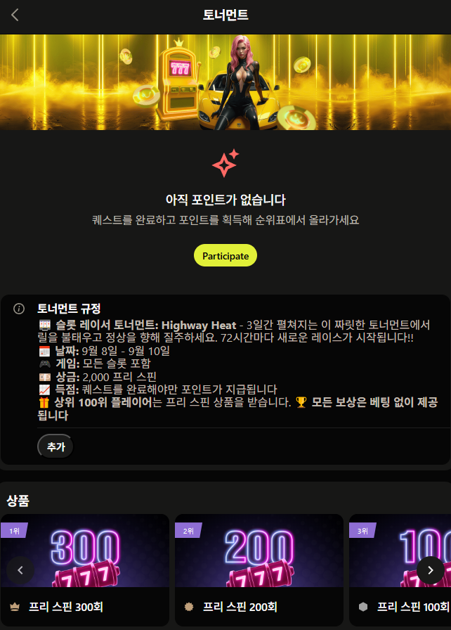 토너먼트는 일정 기간 동안 진행되며, 참여자는 슬롯 레이스 형식의 경쟁을 펼치게 됩니다. 예시로 “Highway Heat” 토너먼트는 모든 슬롯 게임이 포함됩니다. 참가자는 주어진 퀘스트를 완료해야만 포인트를 획득할 수 있으며, 이를 통해 순위표에 이름을 올릴 수 있습니다.