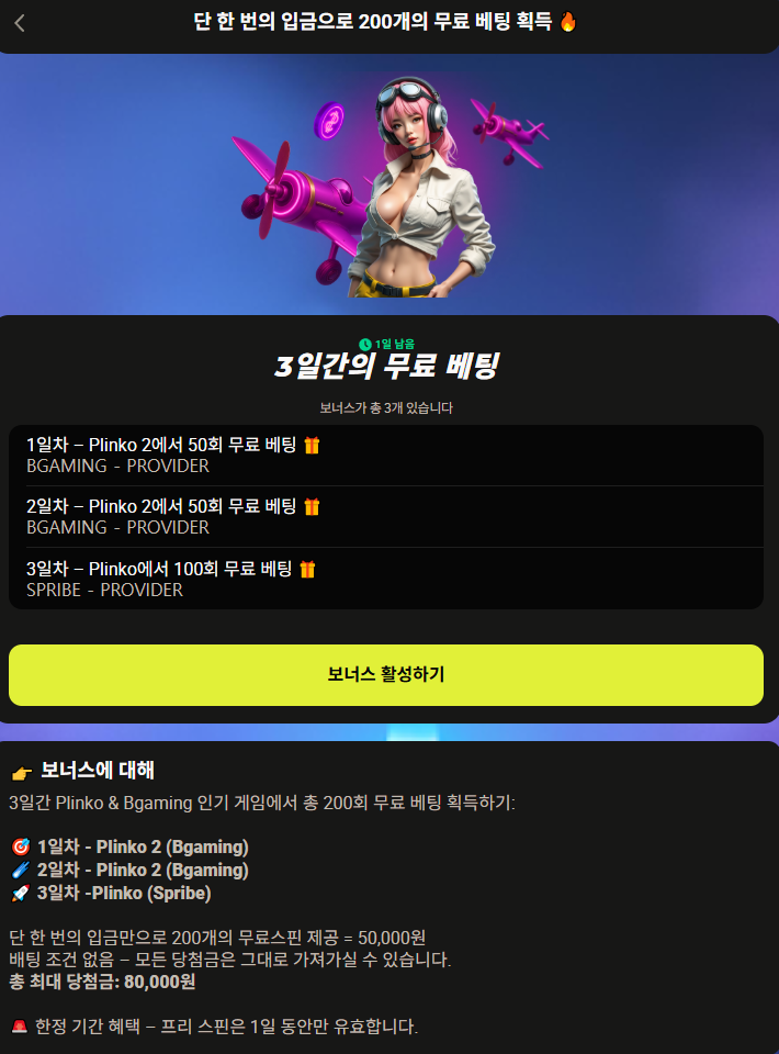 이 이벤트는 단 한 번의 입금만으로 3일간 연속적으로 무료 베팅을 즐길 수 있도록 설계되었습니다. 총 200회의 무료 베팅 기회가 주어지며, 게임별로 구체적인 혜택이 나뉘어 지급됩니다.