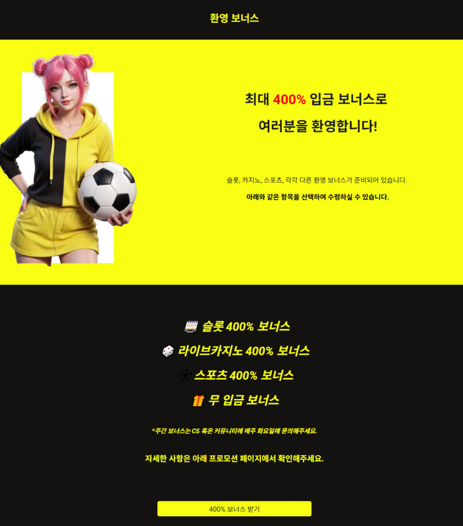 첫 입금 시 최대 400%의 보너스가 지급되며, 슬롯, 라이브 카지노, 스포츠 등 원하는 카테고리를 선택하여 보너스를 활용할 수 있습니다.