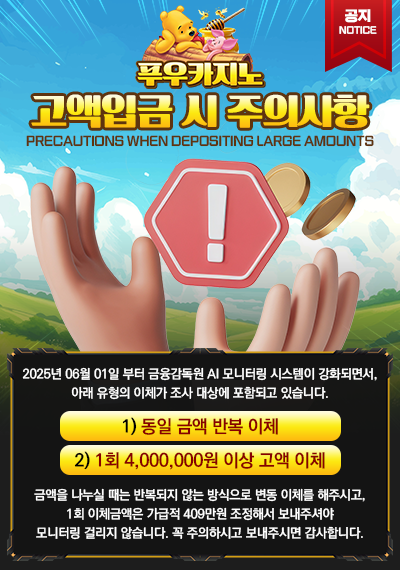 푸우카지노는 회원 계정 보호와 금융사기 예방을 최우선으로 관리하고 있으며, 본인 명의가 아닌 차명 입금은 어떠한 경우에도 인정되지 않습니다. 안정적인 이용을 위해 안내된 기준을 확인해 주시기 바랍니다.