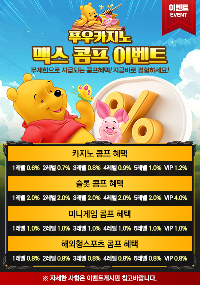 푸우카지노에서는 이용자가 플레이한 콘텐츠에 따라 단계별 콤프 혜택을 제공하는 맥스 콤프 이벤트를 운영하고 있습니다.