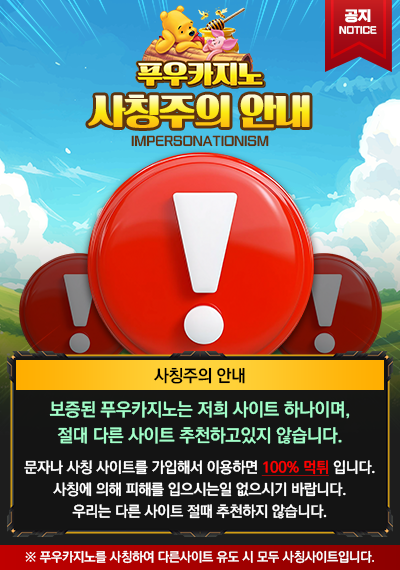 푸우카지노는 단일 공식 사이트만을 운영하며, 그 외 유사 사이트는 모두 사칭에 해당합니다. 이용자는 반드시 정식 경로만 이용해 불필요한 피해를 방지하시기 바랍니다.