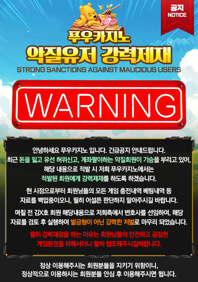 푸우카지노에서는 최근 악의적인 방법을 사용해 부정 이익을 노리는 사례가 확인됨에 따라, 관련 계정에 대한 강력한 제재 조치를 시행하고 있습니다.