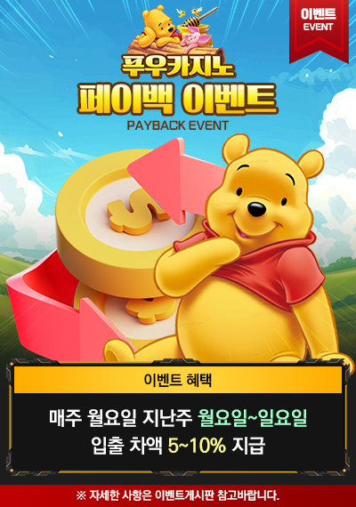푸우카지노에서는 주 단위 이용 내역을 기반으로 입·출금 차액에 따라 페이백을 지급하는 이벤트를 운영하고 있습니다.