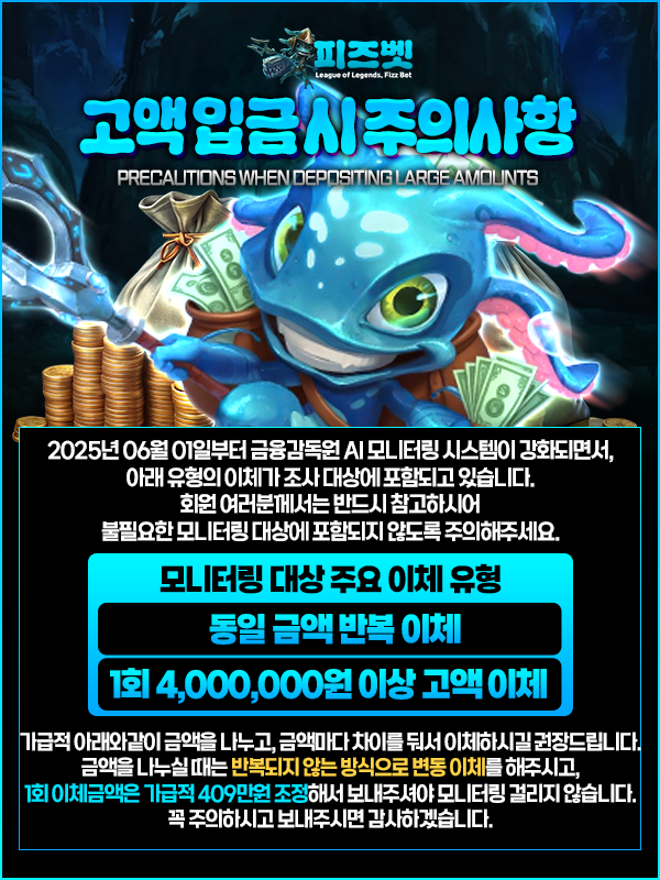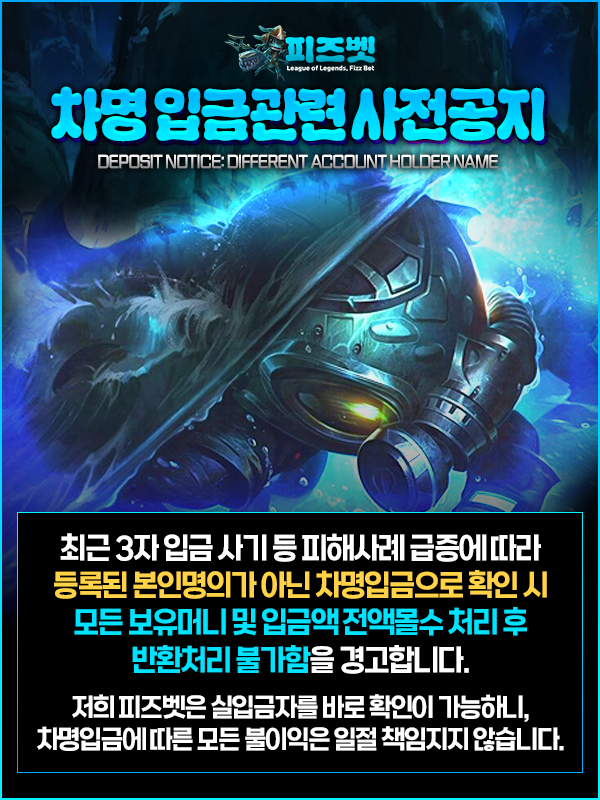 피즈벳은 실입금자 확인이 가능한 구조로 운영되며, 차명 입금으로 발생하는 모든 불이익에 대해서는 별도의 책임이 적용되지 않습니다. 입금 전 반드시 회원 본인 명의 계좌 사용 여부를 확인해야 합니다.