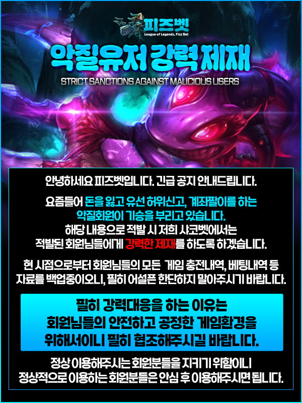 강력 제재 기준은 정상적으로 이용하는 회원의 권익을 보호하고, 공정한 게임 환경을 유지하기 위해 적용됩니다. 정상적인 이용 패턴을 유지하는 회원은 해당 제재와 무관합니다.