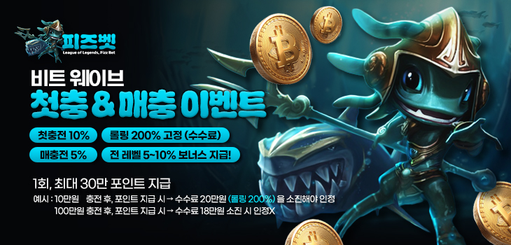 피즈벳에서는 비트 웨이브 시스템을 기반으로 첫 충전과 매 충전 시 적용되는 혜택 이벤트를 운영합니다.