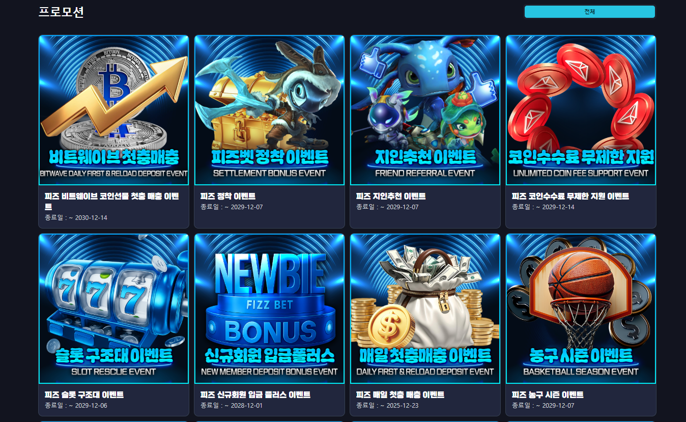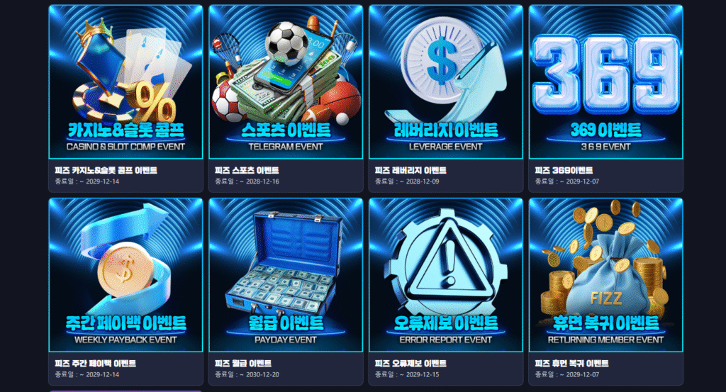피즈벳은 카지노와 슬롯 게임을 중심으로 운영 구조가 구성된 사이트로, 충전·페이백·콤프·추천 이벤트 등 이용 흐름에 맞춘 다양한 참여 요소를 함께 안내하고 있는 곳입니다. 카지노·슬롯 이용을 전면에 배치하면서도, 장기 이용자를 고려한 정착 이벤트와 복귀 이벤트, 자동 적용 방식의 혜택 구조를 병행 구성하여 이용 선택 폭을 넓힌 형태로 운영되고 있습니다. 사이트 전반은 이용 내역과 참여 이력을 기준으로 이벤트가 연동되는 구조로 구성되어 있어, 게임 이용과 혜택 흐름이 자연스럽게 연결되는 점이 특징입니다.