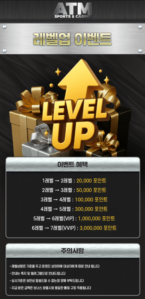 에이티엠카지노는 이용 등급 상승에 따른 보상 체계를 운영하여 단계별 혜택을 제공하고 있습니다. 레벨 변화에 따라 포인트가 지급되는 방식으로 구성된 이벤트로, 이용자의 활동도에 따라 누적 보상이 주어지는 구조가 마련되어 있습니다.