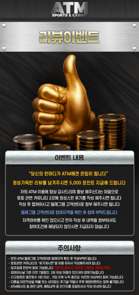 에이티엠카지노는 이용자가 남기는 후기와 피드백을 소중하게 반영하며, 정성스러운 리뷰 작성에 대한 보상 체계를 운영하고 있습니다. 일정 기준을 충족한 리뷰 참여 시 포인트가 제공되는 형태로 구성되어 있습니다.