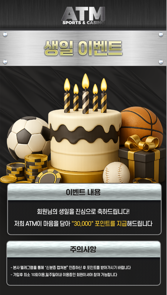 에이티엠카지노는 생일을 맞은 이용자를 대상으로 별도의 포인트 보상 이벤트를 운영하고 있으며, 특정 자격 조건을 충족한 회원에게 정해진 포인트가 지급되는 형태로 구성되어 있습니다.