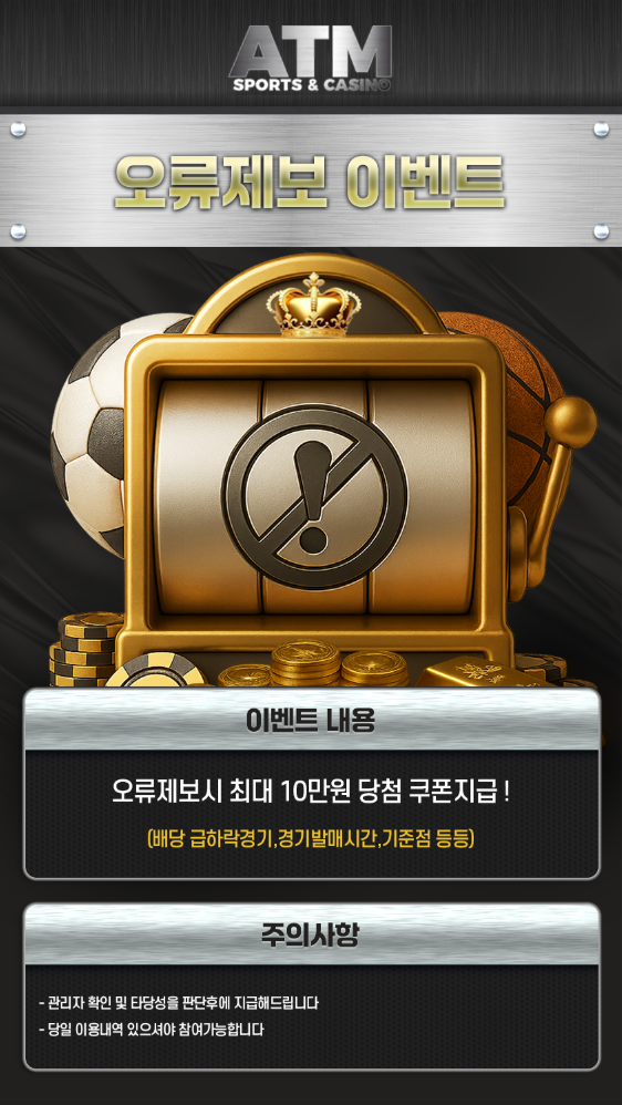 에이티엠카지노는 이용 과정에서 발생할 수 있는 오류를 제보한 회원을 대상으로 보상 형태의 이벤트를 운영하고 있으며, 제보 내용의 타당성이 확인될 경우 쿠폰이 지급되는 구조입니다.