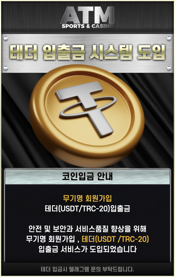 에이티엠카지노는 보다 향상된 보안 환경과 효율적인 이용 흐름을 위해 무기명 회원가입 및 테더(USDT·TRC-20) 기반 입출금 시스템을 도입하고 있습니다.
