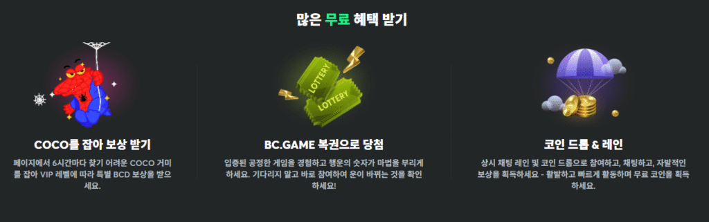 BCGAME 페이지 내에 무작위로 등장하는 COCO 거미를 찾아 클릭하면 보상이 즉시 지급됩니다. 하루 네 번 참여할 수 있으며, VIP 등급에 따라 보상이 차등 적용됩니다. 단순히 웹페이지를 방문하는 것만으로도 참여 기회를 얻을 수 있어 매우 접근성이 높은 보너스 방식입니다.