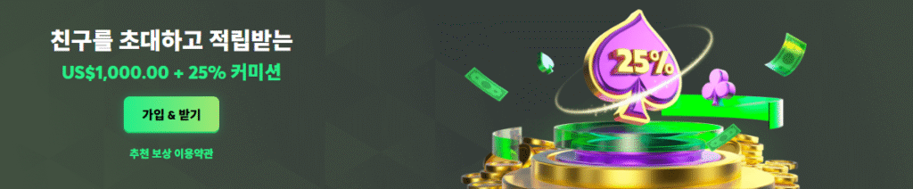 추천인이 활동할수록 회원에게 최대 25%까지의 커미션이 실시간으로 지급됩니다. 슬롯, 스포츠 등 다양한 게임 활동이 커미션 대상입니다.